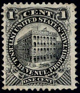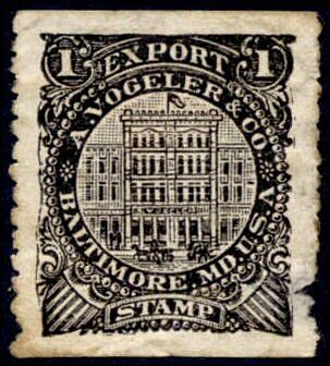 The one-cent black stamp for A. Vogeler & Company is unusual in that the only place to find the company name is on the building in the center, in tiny letters. The stamp was issued from June of 1874 until May 3, 1883. 6,902,431 were printed on silk paper and 20,459,431 on watermarked paper. This copy is on silk paper.