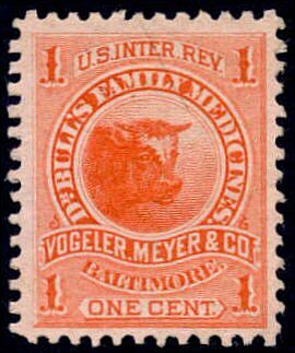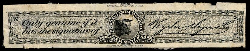 Adolph Meyer emigrated from Germany in 1869 and became a friend and business associate of Charles Vogeler, August's son. Vogeler, Meyer & Company produced Dr. Bull's preparations from July 1, 1877 until shortly after the death of Charles in 1882. A bull's head was chosen to be on the stamp.