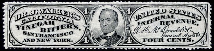 A private die stamp for Walker's Vinegar Bitters was first issued in July of 1870 and last delivered on February 23, 1883. 1,149,024 were produced on old paper, 5,088,677 on silk paper and 492,760 on watermarked paper. This example is on watermarked paper.