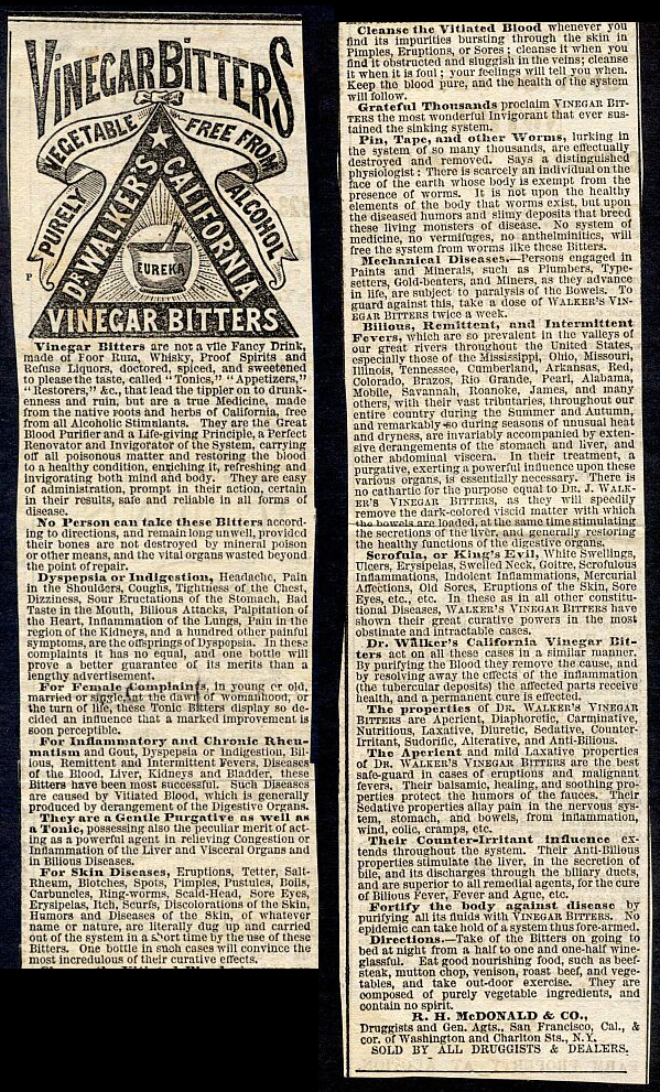 Doctor Joseph Walker devised his fermented Vinegar Bitters in San Francisco in 1849. Richard H. McDonald, a San Francisco druggist, promoted the medicine nationally, and went into partnership with John Campbell Spence to form R.H. McDonald & Company to produce and market it. This company had a New York office with branches in California.