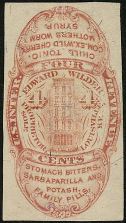 Edward Wilder began to manufacture his range of proprietary medicines in Louisville, Kentucky in 1869. His private die stamps were first delivered later that year, in August. They were last issued on January 28, 1882. The one-cent green was issued both imperforate and die cut. 187,300 were printed on old paper, 183,686 on silk paper and 94,847 on watermarked paper. The die cut copy is on watermarked paper and the imperf copy is on silk paper.