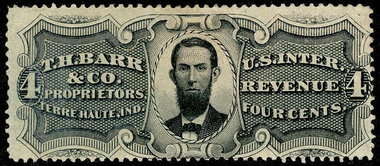 Thomas H. Barr and Company were based in Terre Haute, Indiana and sold regionally. Their product was Barr's Pectoral Elixir, "for various affections of the Lungs and Throat, such as Colds, Coughs, Croup, Asthma, Influenza, Hoarseness, Bronchitis, and Incipient Consumption, and for relief of Consumptive patients in advanced stages of the disease." Private die stamps were issued from October, 1870 through May 3, 1871. 26,250 were printed, all on old paper.