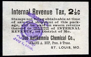 Due to the short time between passage of the War Revenue Law of 1898 and its effective date some companies, mainly in Saint Louis, were given permission to use privately printed stamps on their products until general issue revenues could be obtained. Antikamnia was one of these, and had three different types of provisional stamps printed. Holcombe gives the number of two-and-a-half cent ones printed as 9,000. They were cancelled with the Antikamnia trademark and the first day of the tax, July 1, 1898.