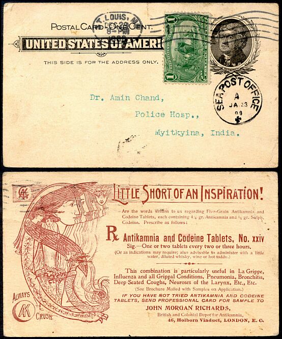 Antikamnia was a junk mail pioneer. The company sent advertisements and samples to its distributors, doctors, and possible customers like lawyers and businessmen. They distributed their advertisements internationally as well - this one went to a police hospital in India in 1898.