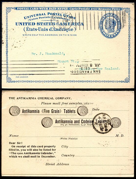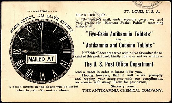 The text side of a card mailed to notify someone to expect their sample. Antikamnia kept promoting its name to the market.