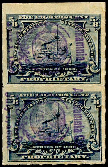General issue proprietary stamps were also given a first-day cancel. In all there are six recorded types of Antikamnia cancels on battleship revenues, some printed and some hand-stamped.