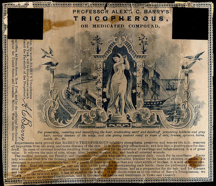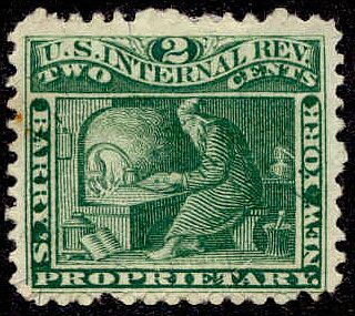 Alexander C. Barry was a wigmaker in New York City before introducing "Tricopherous, or Medicated Compound for Restoring, Preserving and Beautifying the Hair; Eradicating Scurf and Dandruff, to prevent Baldness and Gray Hair; Curing Diseases of the Scalp; and useful in Stings, Cuts, Bruises, Sprains, &c., &c." Private die stamps for this product were issued from June, 1865 through February, 1874. 554,375 were printed on old paper and 323,500 on silk paper. The copy above is on silk paper.
