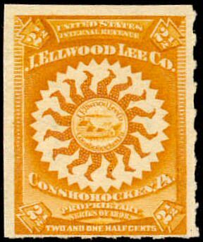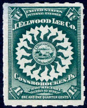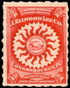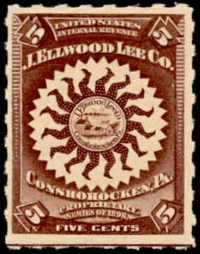 The J. Elwood Lee Company was a relatively small outfit based in Conshocken, Pennsylvania. One of its traveling representatives was Lewis Robie, who was a collector and dealer specializing in private die proprietary stamps. He recognized the opportunity to sell those of L. Elwood Lee at a profit, and late in 1900 the company ordered five different denominations of stamps, probably only needing one. Since the tax was removed as of July 1, 1901, there would have been little chance to use them in any event.