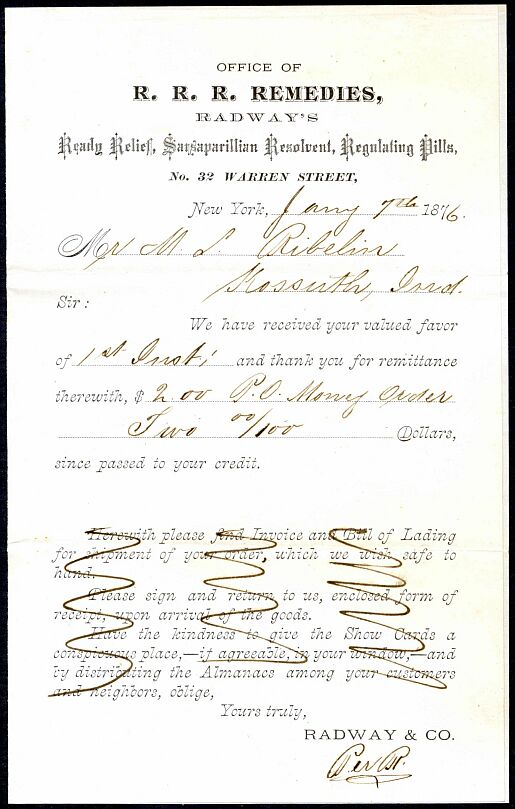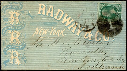 J. & R.G. Radway & Company was formed around 1848 to produce and market Radway's Ready Relief, Conqueror of Pain. Then came Radway's Regulating Pills and Dr. Radway's Sarsaparillan Resolvent, among others. Their private die stamp was first issued February 1, 1867 and last delivered March 1, 1883. 2,416,000 were printed on old paper, 4,394,976 on silk paper and 2,143,226 on pink and watermarked papers. This copy is on watermarked paper.