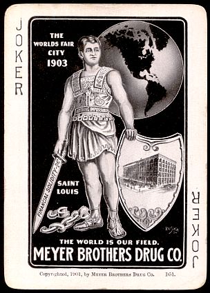 The joker from a deck of playing cards issued for Meyer brothers, also in 1901. The other cards have various Saint Louis scenes on them, as it was too early for them to have had any pictures of actual World's Fair buildings.