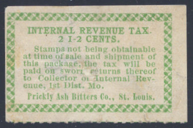 One type of Prickly Ash Bitters handstamp cancel has been identified on battleship revenues.