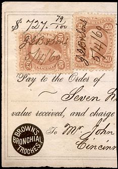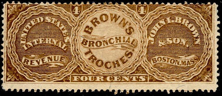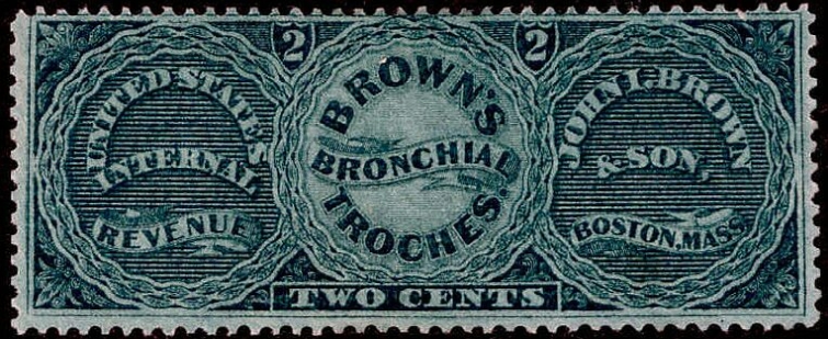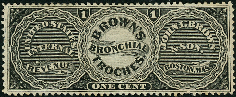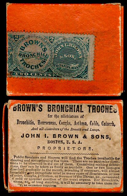 John I. Brown & Son originated Brown's Bronchial Troches in 1850. They also sold Brown's Vermifuge Comfits or Worm Lozenges and other preparations. Three private die stamps were prepared for their use. The one-cent was issued from February, 1863 until May 5, 1883. 2,272,088 were printed on old paper, 783,925 on silk paper and 2,270,062 on watermarked paper. This copy was printed on silk paper.