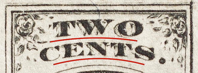 The two-cent J.B. Rose stamp is known to have a double impression which can be seen clearly in the upper "two cents" and the top frame line.