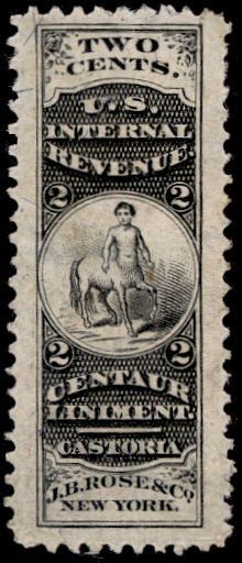 The J.B. Rose Company was another offshoot of the Demas Barnes drug empire. It was set up in 1872, with Charles H. Fletcher as a principal. The major products were Centaur Liniment and Castoria. Private die stamps were issued in two denominations, all of which were issued in black from November of 1872 until November of 1877 in the case of the two-cent and April of 1873 for the four-cent. 1,032,500 of the two-cent denomination were issued on silk paper, and 211,330 on pink and watermarked papers. This one is on silk paper.