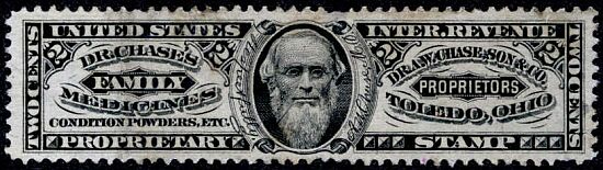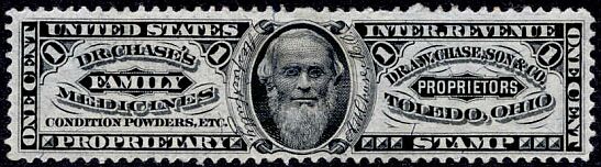 Doctor Alvin Wood Chase was a resident of Ann Arbor, Michigan, but his patent medicines were manufactured in Toledo, Ohio. They consisted, in part, of Dr. A.W. Chase's Kidney-Liver Pills, Dr. W.A. Chase's Ointment, the only unfailing cure for piles, salt rheum, eczema, scald head and all itchy skin diseases, Dr. A.W. Chase's Catarrh Cure, and Dr. A. W. Chase's Syrup of Linseed and Turpentine, a certain cure for asthma, bronchitis, sore throat, croup, coughs, colds and consumption in its early stages. Three stamps were issued for the company in 1877. 7,144 of the one-cent, 4,200 of the two-cent and 4,200 of the four-cent stamps were issued on silk paper, or, in the case of the one-cent stamp, some number of that total were issued on watermarked paper. The two- and four-cent stamps were not issued after1877, while the watermarked one-cent stamps were issued prior to October 1, 1880. Although the stamps were issued in small quantities many are known with full gum, indicating that few were used.