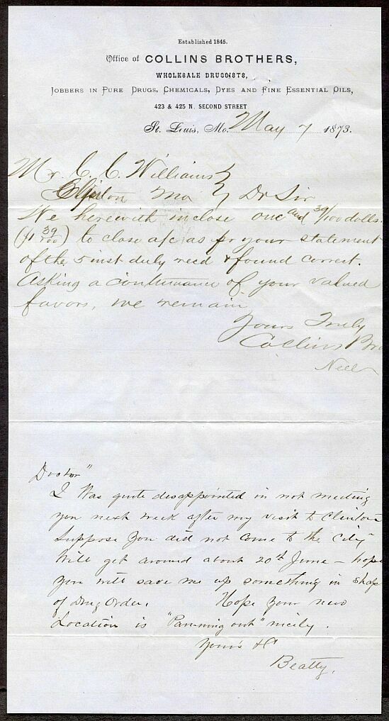 William H. Collins and Louis E. Collins are first mentioned as patent medicine wholesalers in Saint Louis in 1864. From 1867 at least through 1883 their business is shown as "patent medicines and druggists' fancy goods." Their private die stamp was first issued on January 2, 1867, and a second printing apparently took place in December, 1868, for a total of 231,000 stamps on old paper, only 196,900 of which were delivered. In September 1872 another 56,100 were printed, on silk paper this time, but most of these were not delivered. The copy above is on old paper.