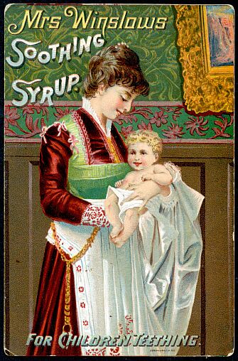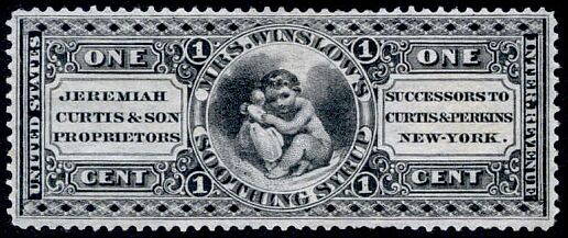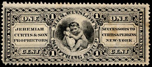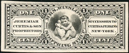 The flagship product of Jeremiah Curtis & Son was Mrs. Winslow's Soothing Syrup, which was first marketed in 1835. It contained a small amount of morphine, and was said to cure all diseases of children. The product was so well known that a movement in a divertimento by Sir Edward Elgar was titled after the remedy. One-cent private die stamps for the company were first issued in February of 1863 and last in 1880. 2,862,188 were issued on old paper and 2,090,000 on watermarked paper.