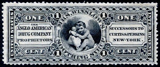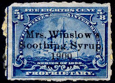 During the Spanish American War tax period the Anglo-American Drug company used printed cancels advertising their product on battleship revenue stamps. In 1905 they removed morphine from the formula and "Soothing" from the brand name.