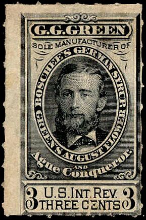 G.G. Green's primary products were Boschee's German Syrup for diseases of the throat and lungs, Green's August Flower to treat things like dyspepsia and pain in the side, and Green's Ague Conqueror for malaria, chills and fever, and the worn-out feeling. The firm was in no hurry to have private stamps prepared, but in May of 1878 the first were issued. The final ones were issued in April of 1883. 5,074,630 were printed, all on watermarked paper. At some time a delivery of rouletted copies was made, but the number perforated that way is unknown.