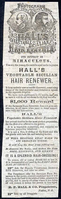 Doctor Reuben P. Hall and Philander Ring (Ring's Vegetable Ambrosia) formed a business relationship whereby Ring would market Hall's Vegetable Sicilian Hair Restorer, the formula for which Hall said he had received from a destitute Italian sailor. Ring did this for some time, and then became curious enough to ask a chemist friend to analyze the preparation. The analysis resulted in questions asked of Doctor Hall and a termination of the relationship. By 1865, Demas Barnes & Company became wholesalers for the product. In the middle 1870's J.C. Ayer & Company bought the factory and ran it as a subsidiary until the 1920's. The product was dropped entirely around 1930.