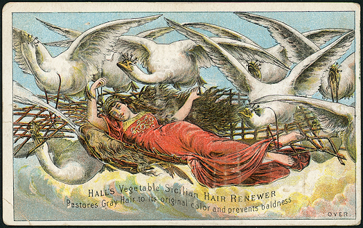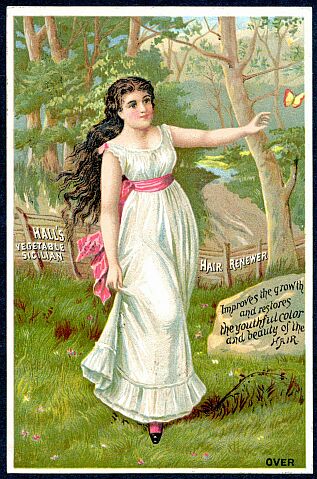 Trade cards promoting Hall's Vegetable Sicilian Hair Renewer, the "first preparation perfectly adapted to cure diseases of the scalp..." and Buckingham's Dye for the whiskers.
