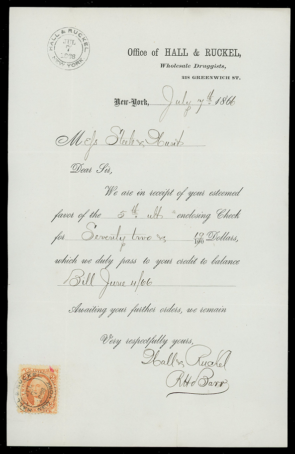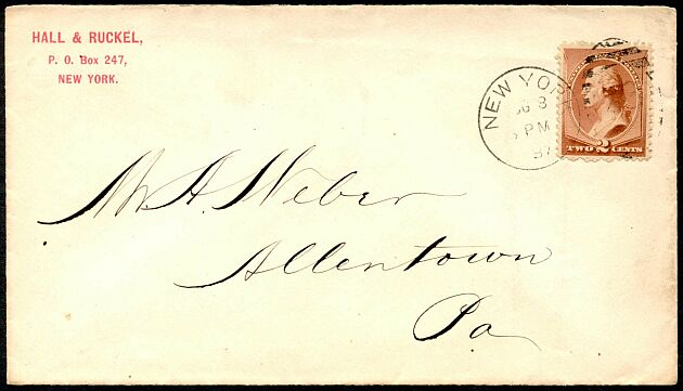 Hall & Ruckel stamps were issued in two denominations. The one-cent was first issued in October, 1865, and last issued February 5, 1883. 2,373,112 were issued on old paper, 1,650,028 on silk paper and 2,835,592 on pink and watermarked papers. The one above is printed on watermarked paper.