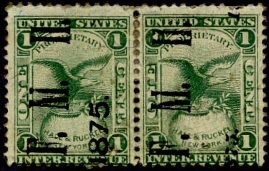 A pair of Hall & Ruckel stamps with H.F.M. cancels, to be used on Herrick's Family Medicines products. Note that the date differs markedly in size between the left and right hand cancels.