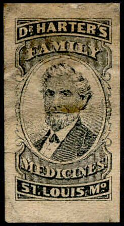 Those issued for The Dr. Harter Medicine Company or Dr. Harter's Family Medicines were issued form November of 1873 until April 10, 1883. 3,060,000 were printed on silk paper and 9,062,114 on pink and watermarked papers. This copy is on watermarked paper.