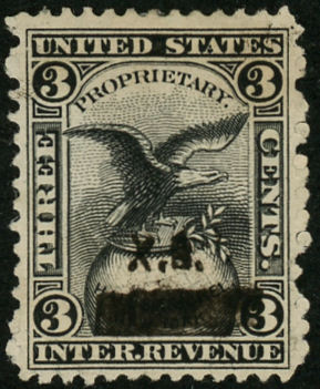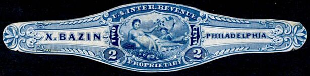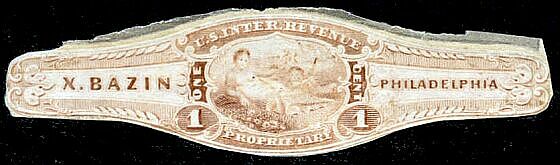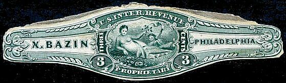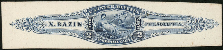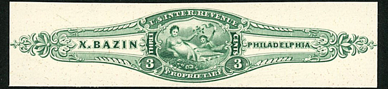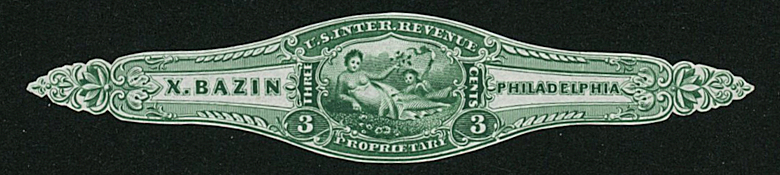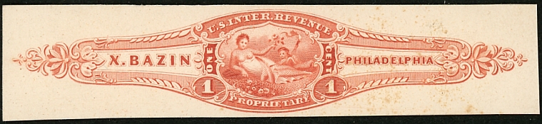 X. Bazin ordered private die stamps very early. A die was approved on October 2, 1862, and his plates were ready for printing by January 19, 1863, as that was when Butler & Carpenter wrote to ask what colors and quantities were wanted. A letter in December of that year said that the stamps had been ready for some time but none had been ordered, and asked whether there was an intention to use them. In March of 1864 Butler & Carpenter wrote to the Bureau of Internal Revenue indicating that no stamps had been ordered, and suggesting that the Bureau ask Bazin whether he intended to use them.
