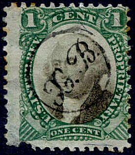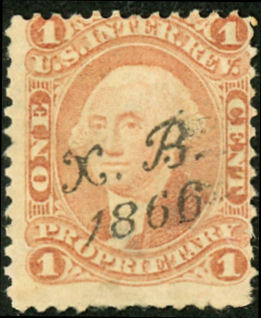 A proof of the one-cent stamp. It is printed on India paper and the end ornaments have been cut off. 422,400 of the one-cent stamps were printed, but apparently all were destroyed by Butler & Carpenter in 1867.