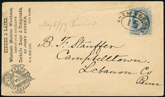 An 1879 cover from Kidder & Laird. At the time, they served as a wholesale medicine warehouse.