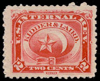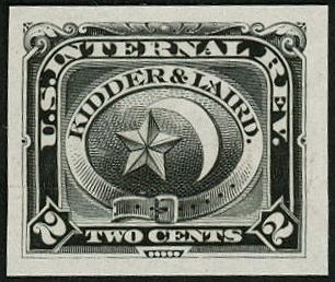 A trial color proof of the two-cent Kidder and Laird stamp on India paper.