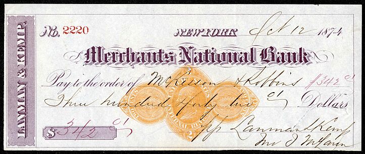 Lanman & Kemp used a variety of checks with imprinted revenues. This one, bearing an RN D-1 imprint, was written to the firm of McKesson & Robbins.