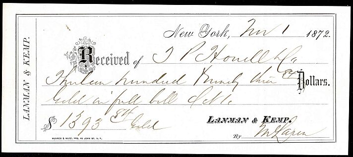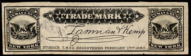 Lanman & Kemp liked their phoenix design so well that they had it registered as a trademark. When the Civil War proprietary tax was repealed, as of July 1, 1883 a number of companies that used private die stamps had facsimile labels created for their products. Lanman & Kemp was one of these.