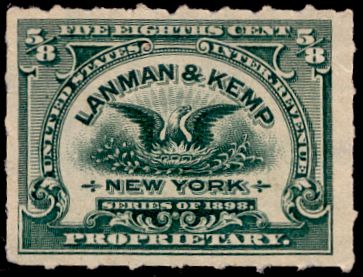 They also used private die stamps to pay the proprietary taxes imposed to help pay for the Spanish American War. 5/8 cents paid the tax on a twenty-five cent item. 360,000 of these stamps were printed and perforated first by rouletting, then later by hyphen hole perforations. This one was rouletted.