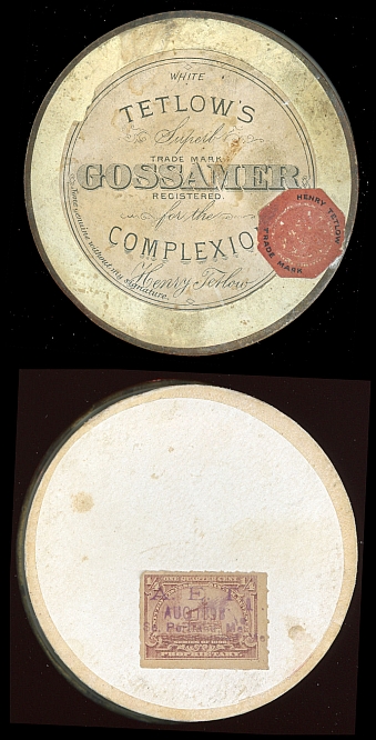 This package of Gossamer face powder was sold in 1898, as the battleship tax stamp is still on the bottom of the package. Tetlow did not use private die stamps during the Spanish American War tax period.