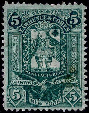 Lawrence and Cohen used First Issue playing card stamps prior to August of 1864. At that time the tax was one cent per pack up to 18 cents in cost, two cents to 25 cents, three to 30, four to 36 and five cents over 36 cents in cost. After August five cents would have been useful only in multiples until that became the rate per pack in August of 1866. The copy above was probably used in early 1864.