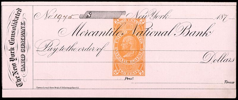 The check bears an RN-H4 imprint meant to pay the tax on checks in effect in some form from October 1,1862 until July 1, 1883.