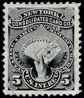 The five-cent New York Consolidated Card Company stamp was issued from sometime in 1876 through March of 1883. A total of 10,063,000 were issued on silk, pink and watermarked papers. No breakdown by type is available. This copy was printed on silk paper.