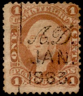 The large five-cent Andrew Dougherty stamp was issued from August of 1866 to sometime in 1867. A total of 4,631,985 were issued on old paper, 7,638,947 were issued on silk paper, and 179,496 on pink paper. The stamp above was printed on silk paper.