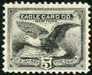 The five-cent Eagle Card Company stamp was issued from early 1880 into February of 1883. A total of 1,800,900 were issued on watermarked paper.