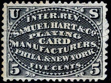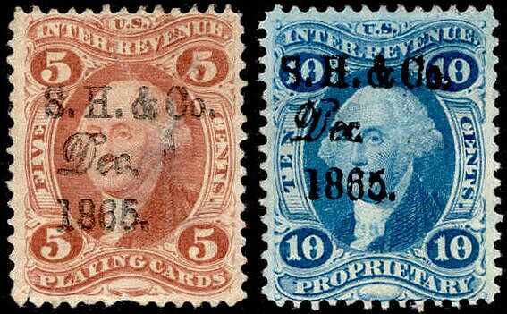 Samuel Hart & Company was in existence prior to the printing of its private stamp and is known to have used first issue playing card and proprietary stamps. In December of 1865 stamps of these denominations would have been suitable for paying the tax on packs of cards priced over 25 cents.