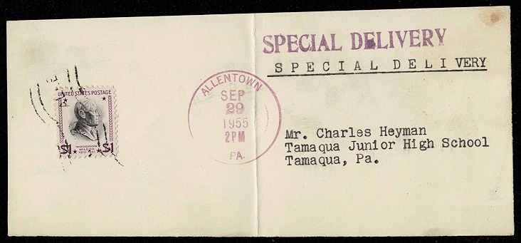 Fifty-five cents was the rate for a nine pound package sent to Zone 1 or Zone 2 (up to 150 miles) between October 1, 1953 and February 1, 1960. The first pound cost twenty-three cents, and each subsequent pound or fraction of a pound cost 3.95 cents. Between January 1, 1952 and July 14, 1969, special delivery for other than first class for a package weighing more than two pounds and less than or equal to ten pounds the cost was forty-five cents, making the cost for this September 1955 package an even dollar. The Liberty dollar stamp had only been issued about a month before, so there would have been a supply of Prexies still around.
