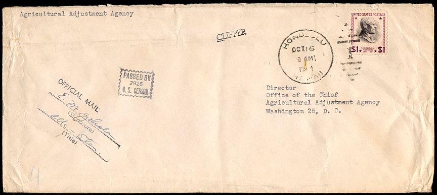 This quintuple rate cover was mailed from Hawaii to Washington, DC in October of 1944. The censor marking is interesting, and there is a smudged blue dot on the back, indicating no need to censor it at any other mail point it passed through.