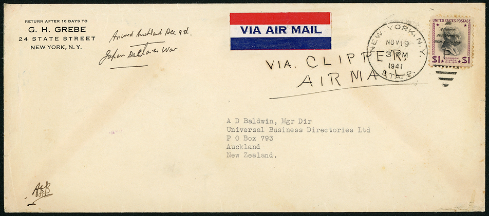 This flight departed Honolulu on December 4 for Canton Island, where it remained the night of December 5. Stopping at Suva, Fiji, the flight went on to Noumea, New Caledonia, leaving there the morning of December 8 for Auckland. Since by then the International Date Line had been crossed, this was the morning of December 7 in Honolulu. A notation in ink on the cover by its recipient, A. D. Baldwin, shows that it was delivered promptly: “Arrived Auckland Dec 9th – Japan Declares War.”