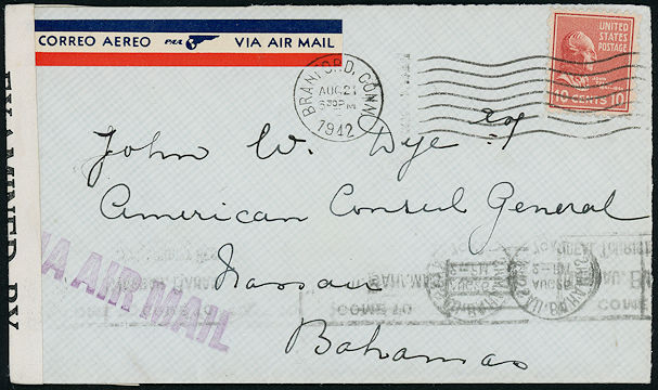 This cover was mailed to the American Consulate at Nassau in 1942.