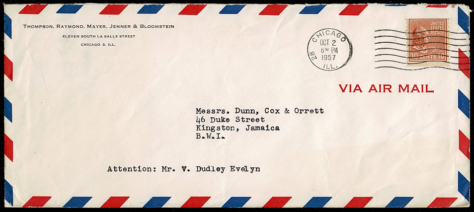 A ten cent coil was used on this 1957 cover to Kingston, Jamaica. Ten cent coils were last issued in 1955.