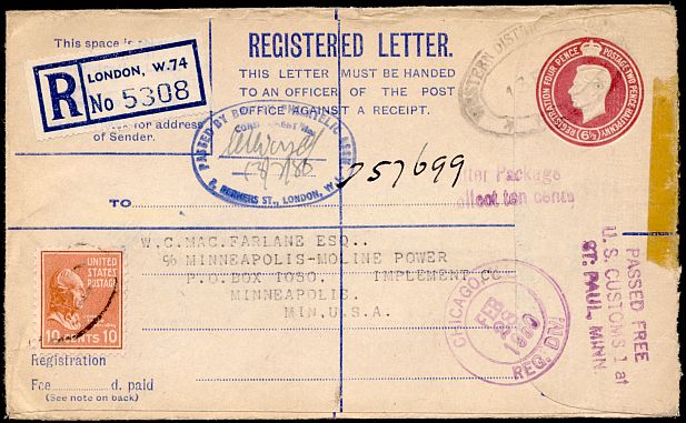 Although the payment of a customs clearance fee was usually accounted for using a postage due stamp, in some cases a regular postage stamp was used instead. This 1950 registered letter from London was examined at customs and the ten cent fee was paid using a ten-cent Prexie.