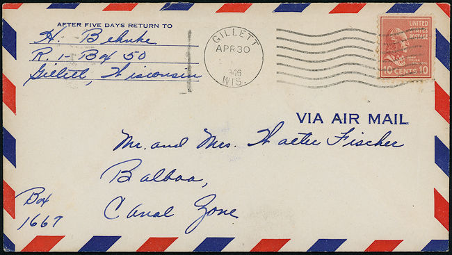 The airmail rate to the Canal Zone was ten cents per half ounce from April 1, 1945 to October 1, 1946.