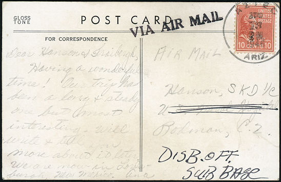 An airmail postcard sent to the Canal Zone in April of 1946. Postcards did not get their own domestic airmail rate until January 1, 1949.